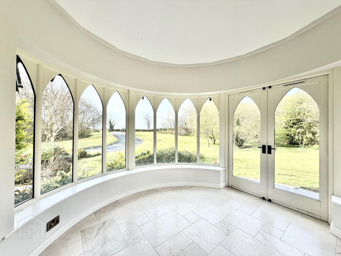 Wooden double doors leading to gardens