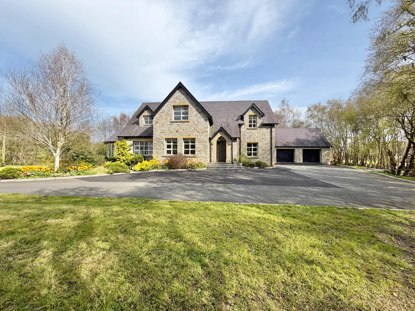 A stunning family home just minutes from Omagh, offering spacious, well-designed living throughout. Features a bright living room with multi-fuel stove and an open-plan kitchen/dining area with bespoke units, granite worktops, AGA cooker, and island. Ground floor includes a sunroom, utility room, bedroom with ensuite, and guest WC. Externally boasts landscaped gardens, electric gates, tarmac driveway, and double garage with extra space. Viewing is highly recommended and strictly by appointment through the agent.