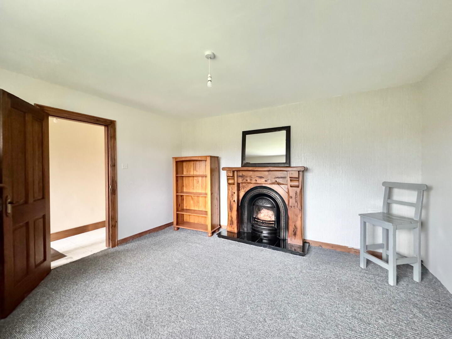 Open fire with wooden surround and cast iron inset & tile hearth